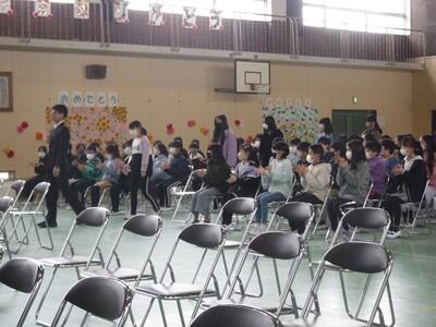 1校時に全校児童が体育館に集まって、「6年生を送る会」を行いました。この日は、「かめっち」も登場です!6年生の入場前に体育館に現れた「かめっち」を見て、驚き喜ぶ子どもたちでした。