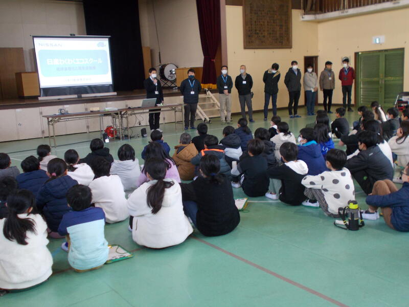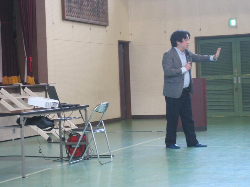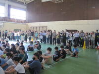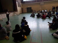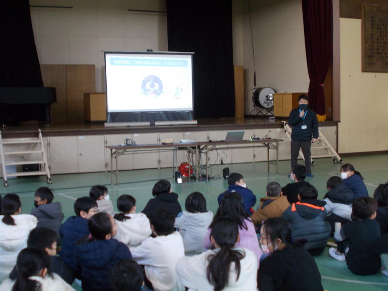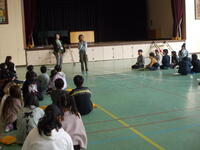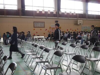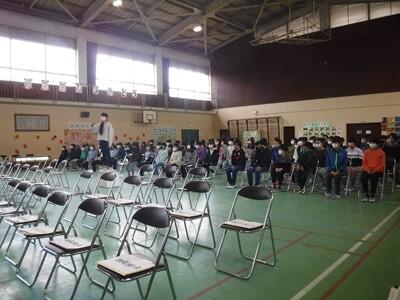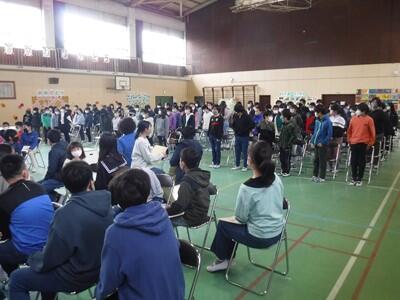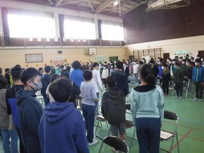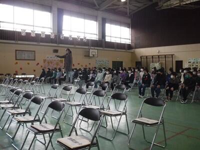 体育館に全校児童が集まって修了式を行いました。話を聞く態度が立派でした。