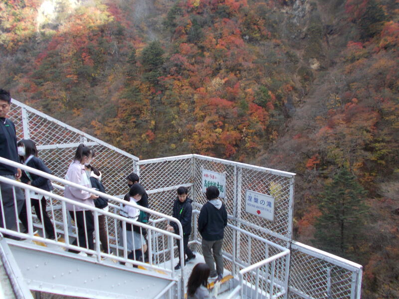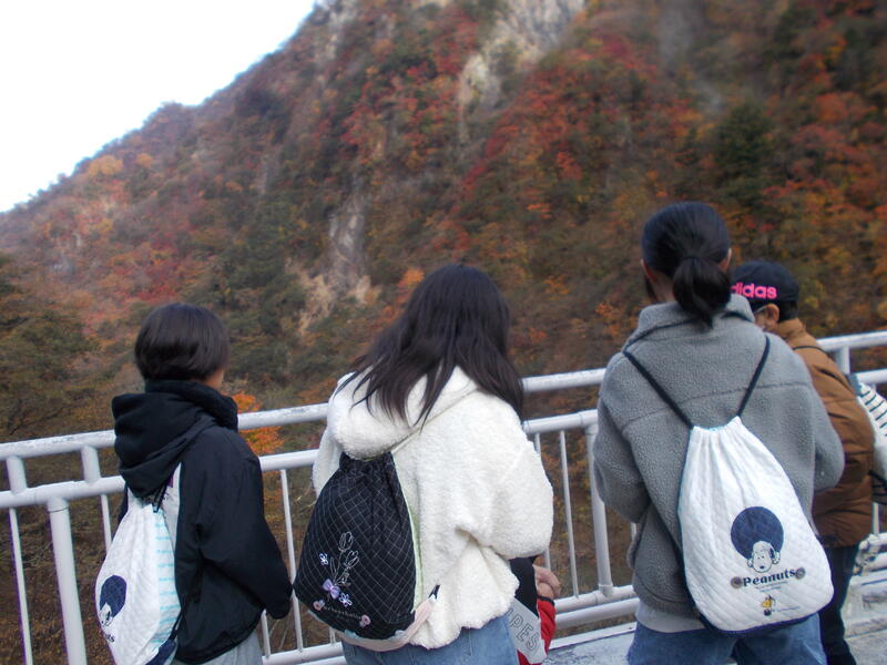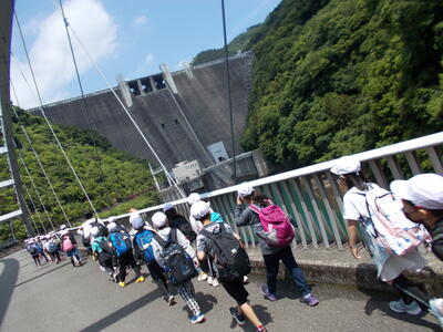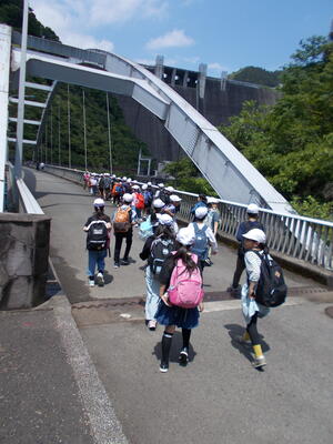 青葉のきれいな山々を見ながら、ダムの放流場所に向かって歩きました。気持ちが良くて、楽しくて、おしゃべりが弾んでいました。