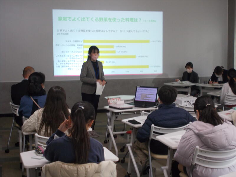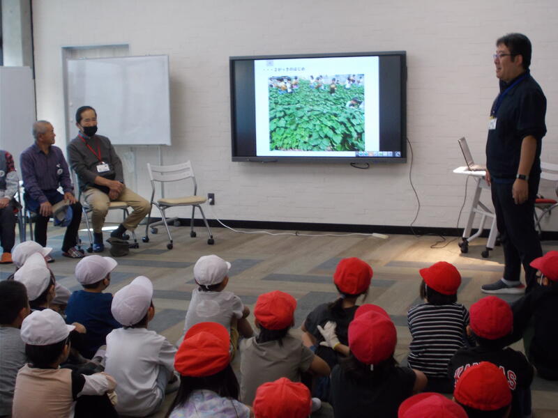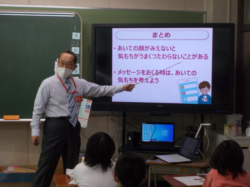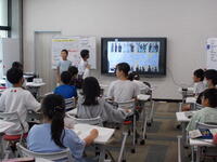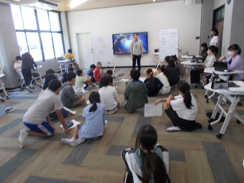 始めに授業参観していただきました。「挨拶をしてくれてうれしいです」「マスクをつけている子が多いのですね」「電子黒板、P'sラボ、家庭科室など学習環境が整備されていることを感じました」などの感想をいただきました。