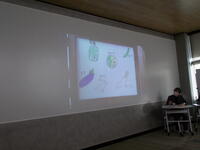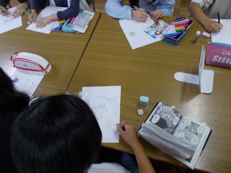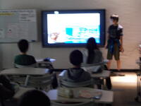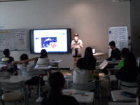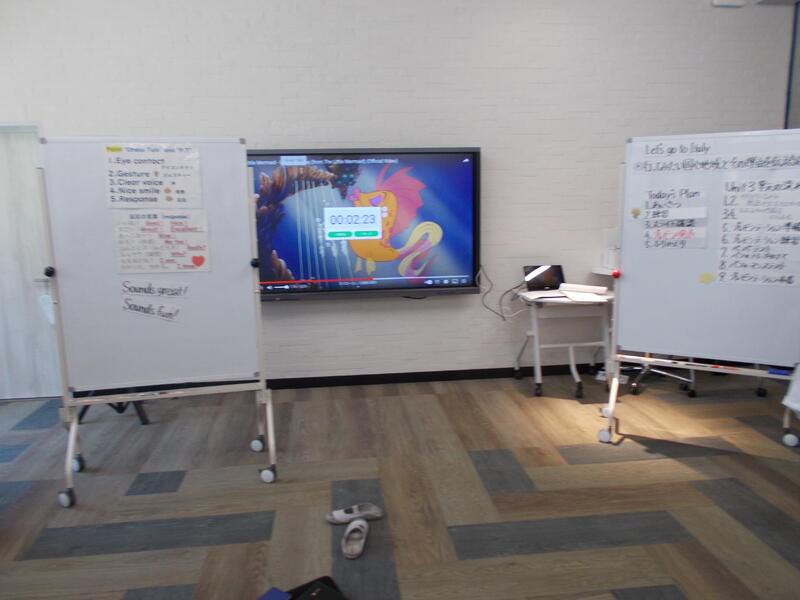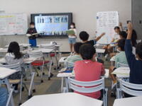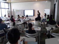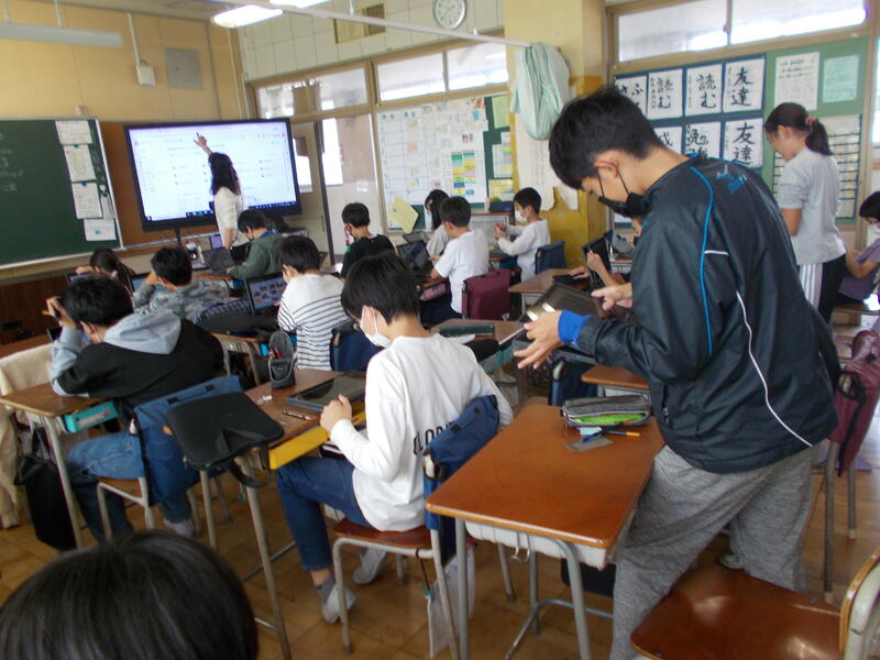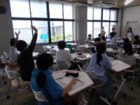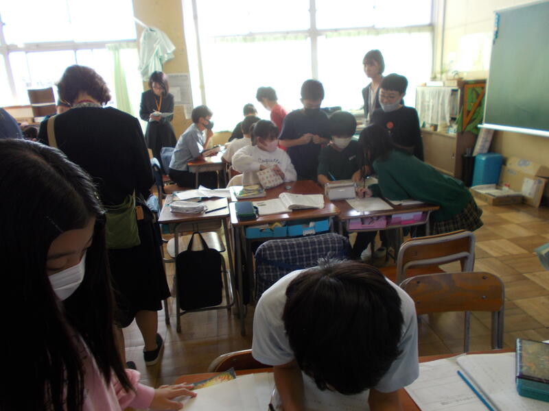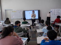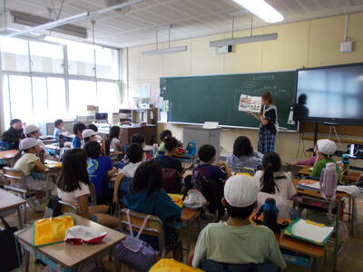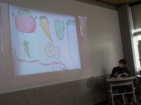 2年生が外部講師による英語教室を行いました。大盛り上がりの声が廊下に聞こえてきました。いろいろな色や果物の言い方をノリノリで発声しました。