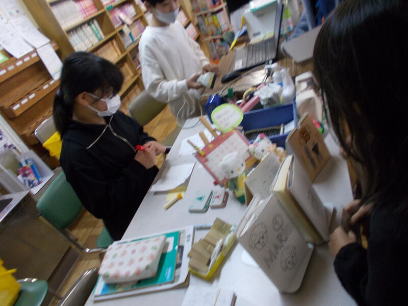 明日は桃の節句です。校内に飾られているひな人形に足を止める人がたくさんいます。