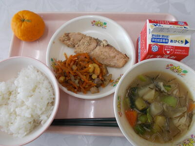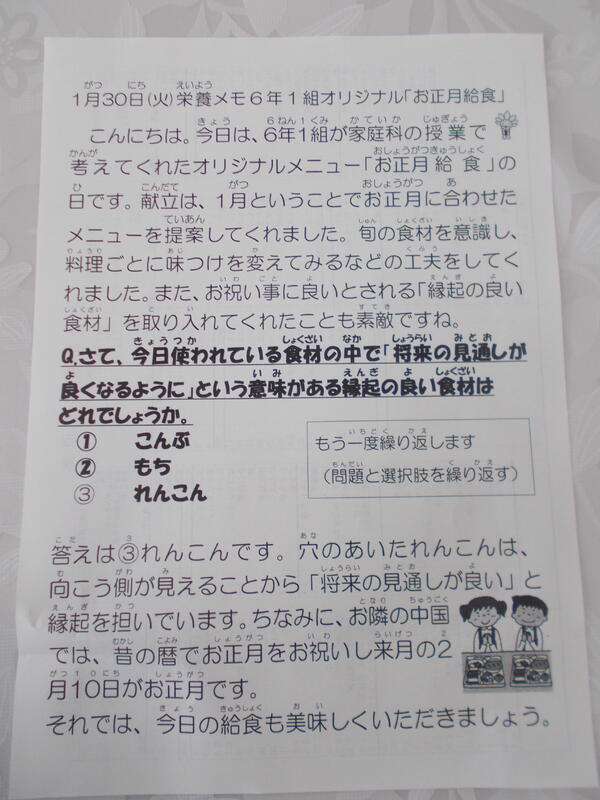 この日の給食の献立は、6年3組さんのオリジナルメニューです。いろいろと工夫されていて、おいしくいただきました!