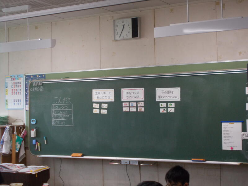 黒板には、献立の食品の「三色分け」がしっかりとできていました。