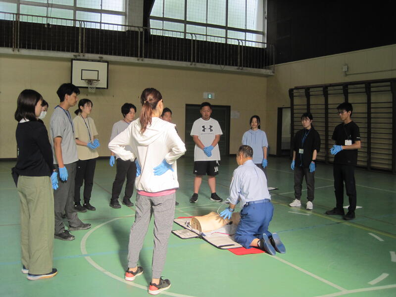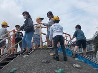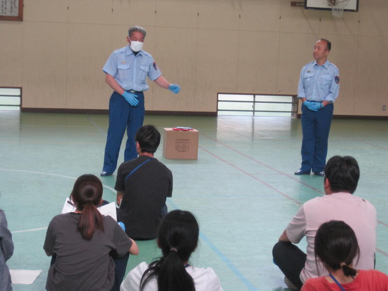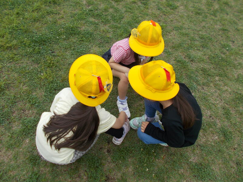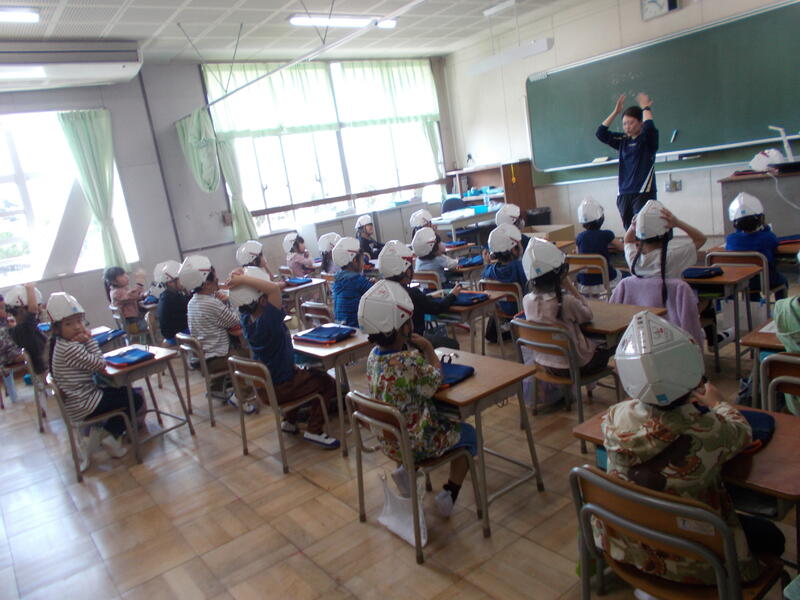 1年生は、訓練の前に市から支給していただいた折りたたみのヘルメットの使い方を練習していました。
