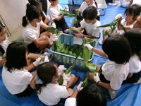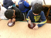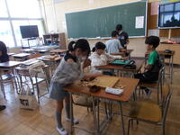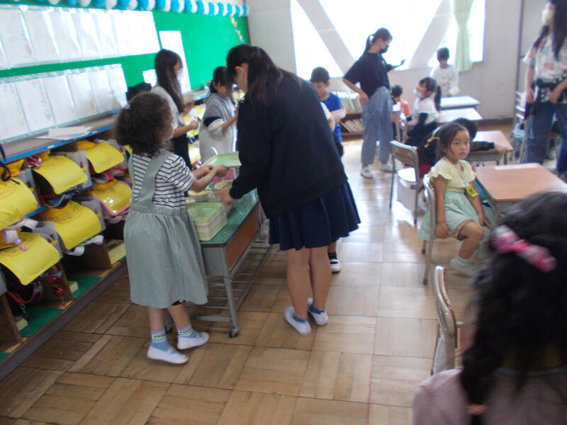給食の片づけのときには、6年生が手伝いに来てくれました。牛乳パックのたたみ方や食器の片づけ方を優しく教えてくれました。