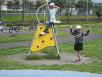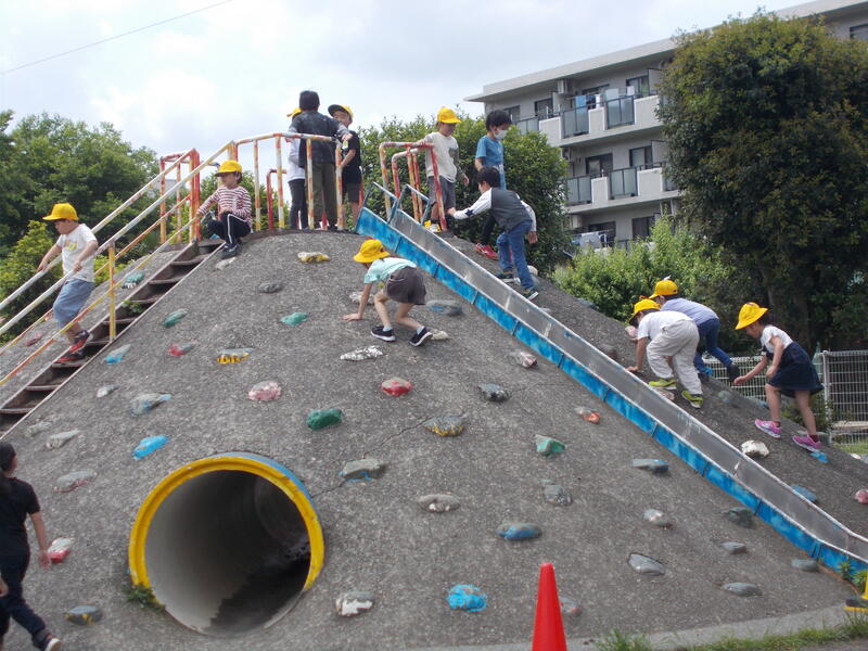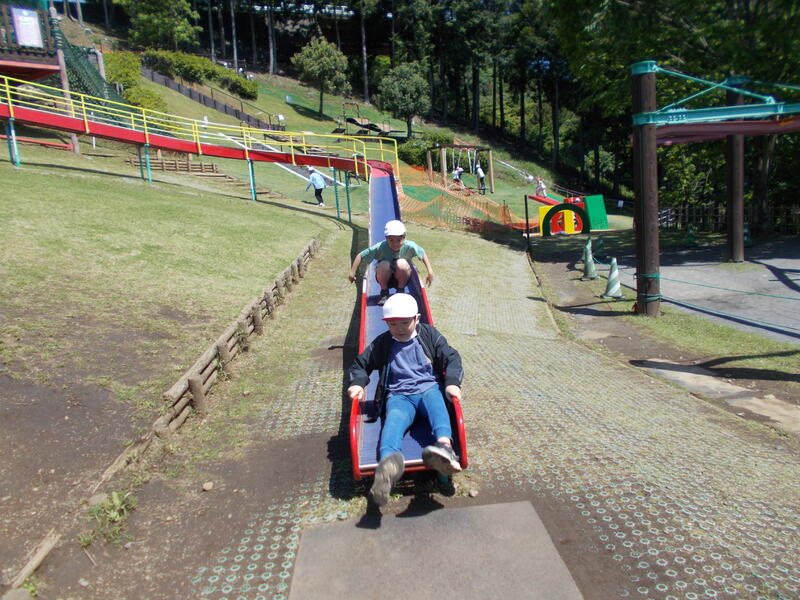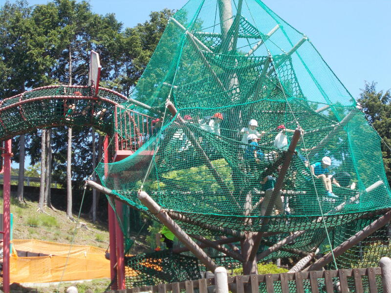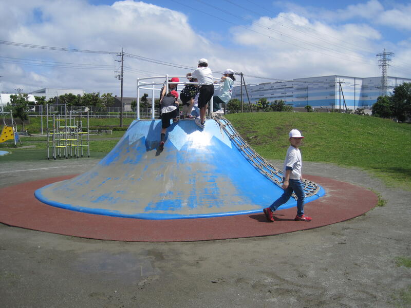 あいかわ公園では、アスレチック遊具で思い切り遊びました。「1番高いところまで行ったよ!」「~回もすべり台やってお尻が痛くなっちゃった。」などの声。とても楽しそうでした。