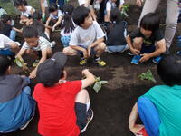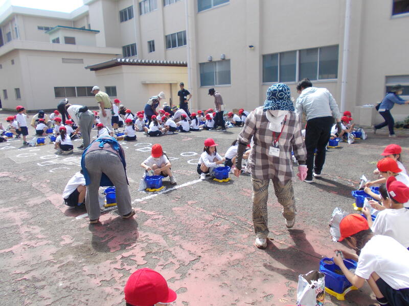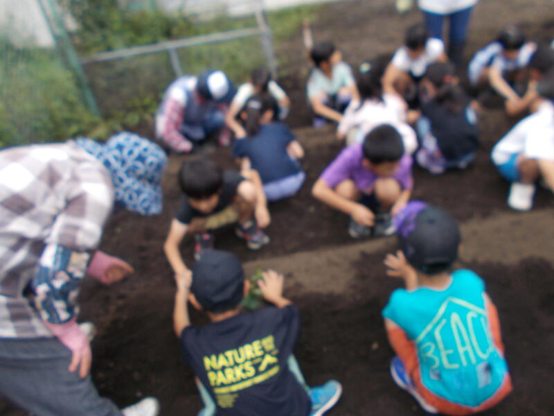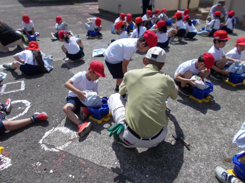 1年生がアサガオの種を植えました。先生の話をよく聞きながら、一生懸命作業していました。
