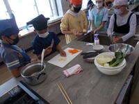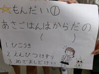 3色の食材とその働きを確認していきました。その後、担任の朝食のメニューで足りないものを考えるときには、サラダ、野菜炒め、みそ汁など、よく考えてアイデアを出していました。