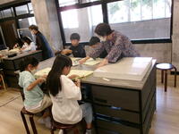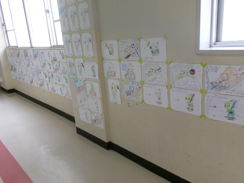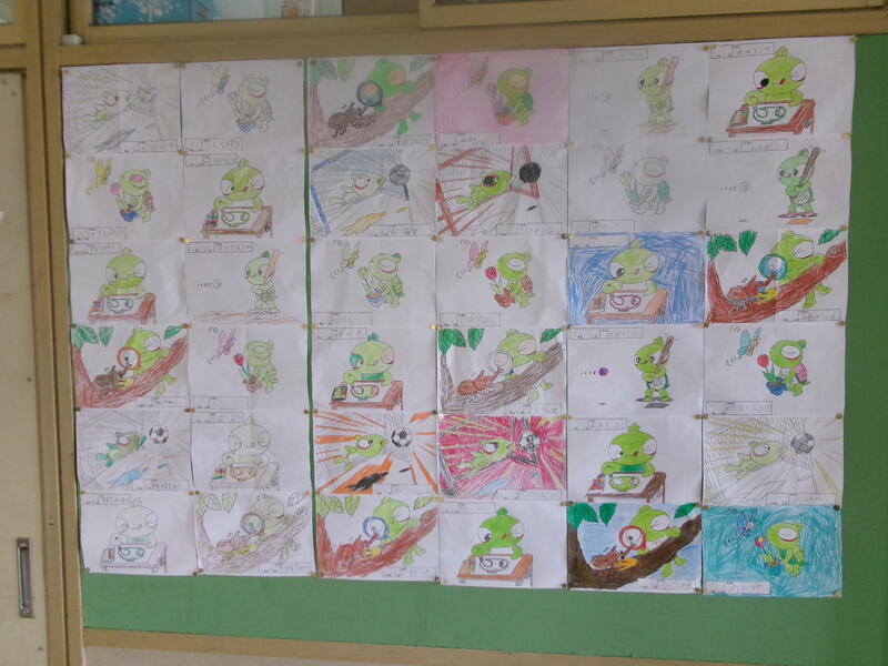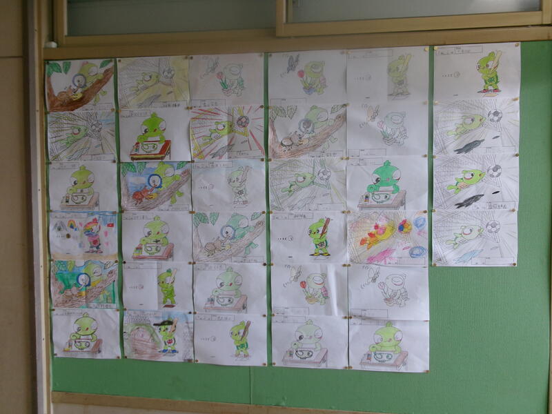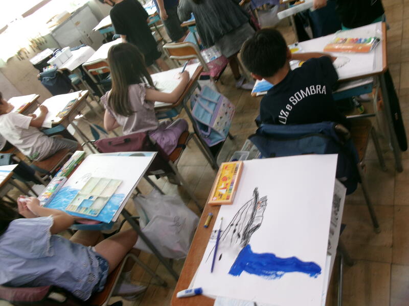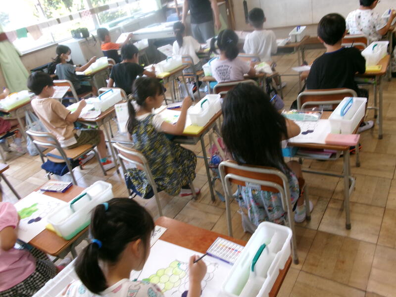 図工で「おはなしの絵」の色ぬりをしていました。画用紙には、おはなしに登場する動物がのびのびと描かれていました。