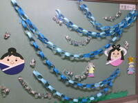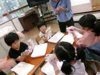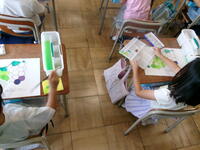 3年生の外国語の時間は、好きな7つの色でにじを作っていました。「I  like  red. I  like  pink.・・・」と7色を英語で発表しました。