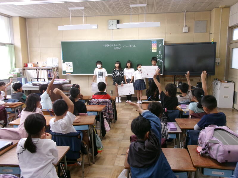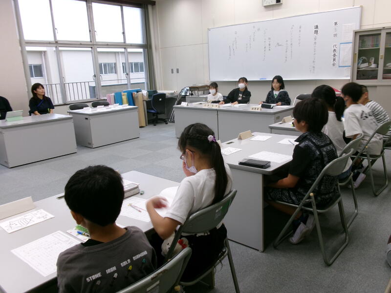 代表委員会では、今年度の東原小のスローガン「あいさつの太陽をきらめかせよう!みんなが楽しい東原」の取組についての話し合いをしていました。