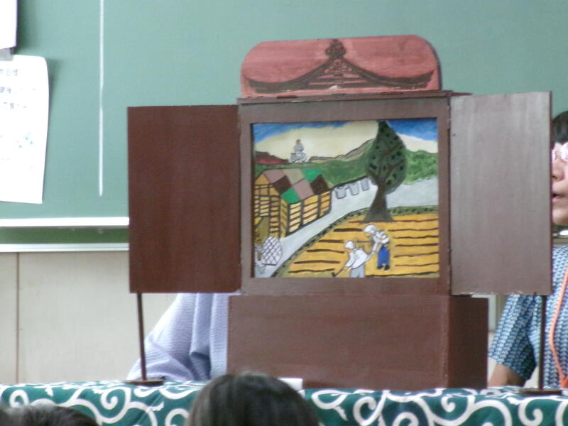 手作りの枠に入った紙芝居、この雰囲気だけでもワクワクします。なべっつるし、バカヤロー先生など4つのお話を聞きました。