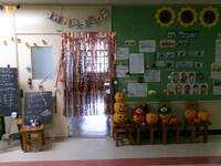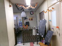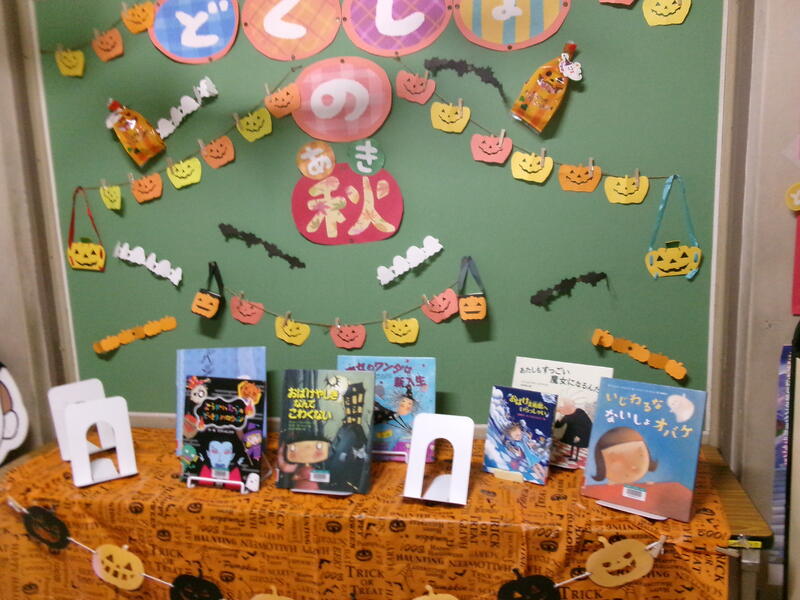 給食室前と図書室は、ハロウィンムードがいっぱいです。図書室の本の紹介コーナーには、おばけ関係の本が紹介されています。
