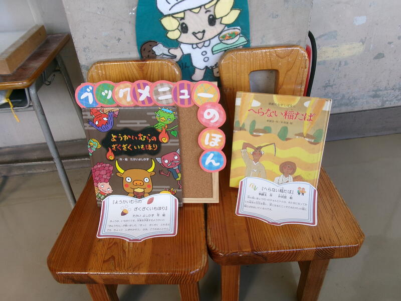 「本を読んでほしいな。」「食べてほしいな。」の想いが込められたメニューです。本は、配膳室前に展示しています。
