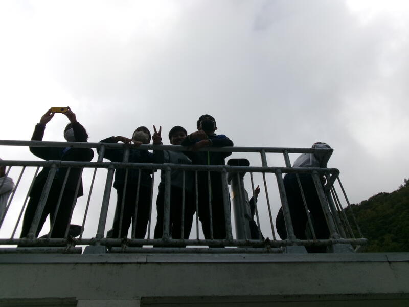 インクラインという乗り物で急斜面を上がり、ダムの上に行きました。先に上に着いている友だちに手を振るみんなです。