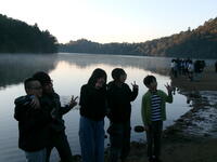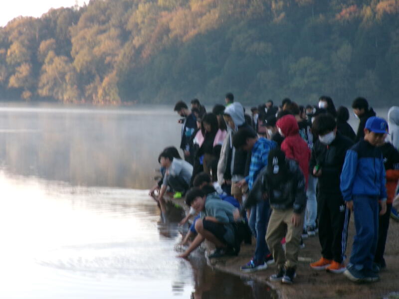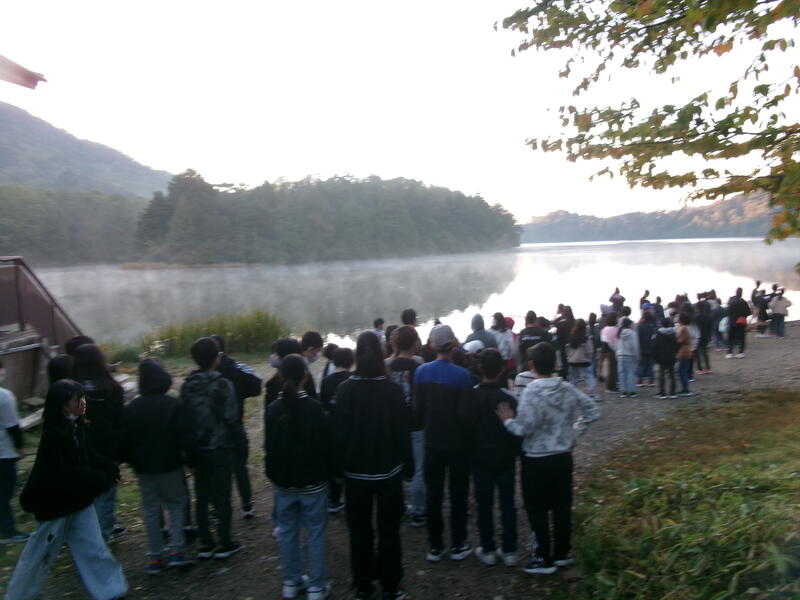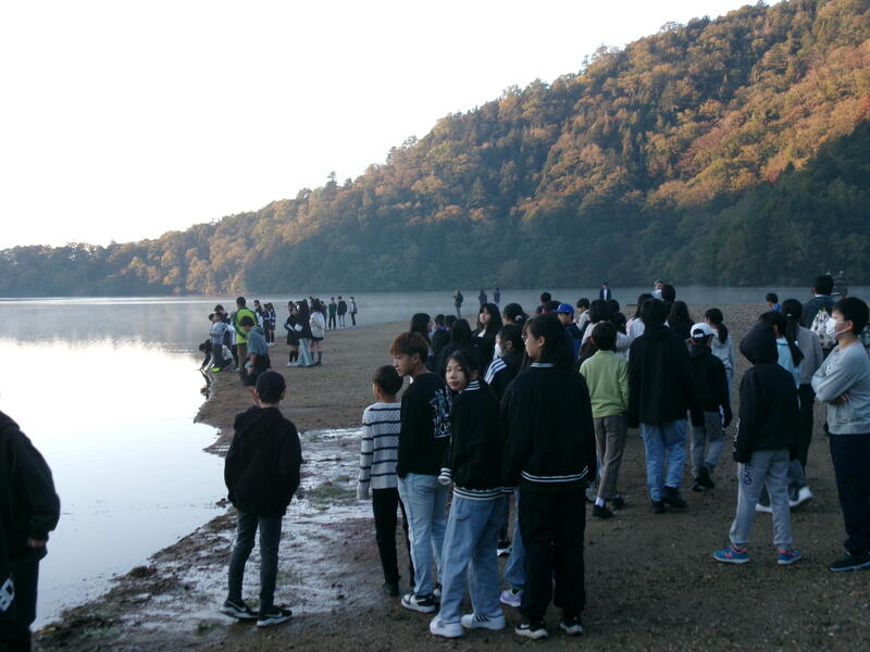 湯の湖の湖面から湯煙があがり、山には朝の光が当たり、心洗われるとてもきれいな景色でした。水鳥が飛んだり潜ったり姿も見て、自然を満喫しました。自然と「きれいー!」と声が上がっていました。
