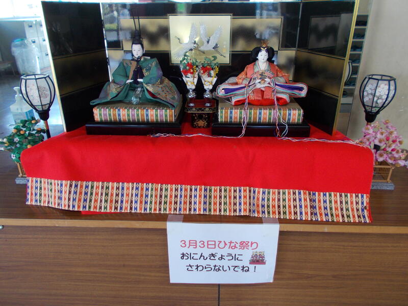 明日は桃の節句です。校内に飾られているひな人形に足を止める人がたくさんいます。