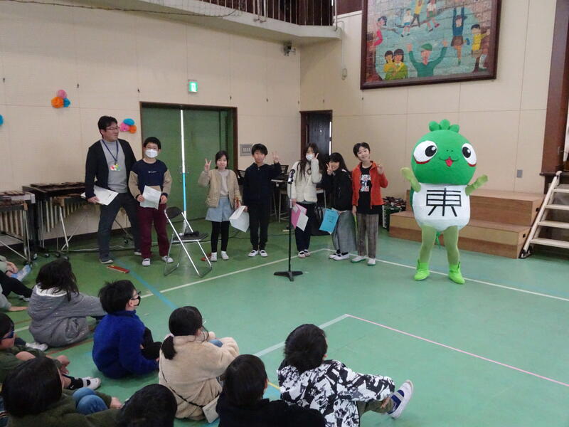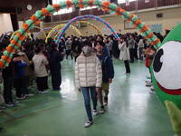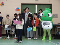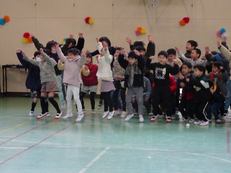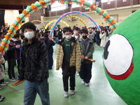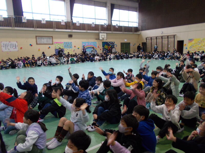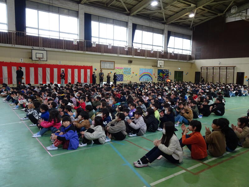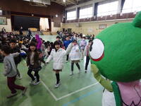 1校時に全校児童が体育館に集まって、「6年生を送る会」を行いました。この日は、「かめっち」も登場です!6年生の入場前に体育館に現れた「かめっち」を見て、驚き喜ぶ子どもたちでした。