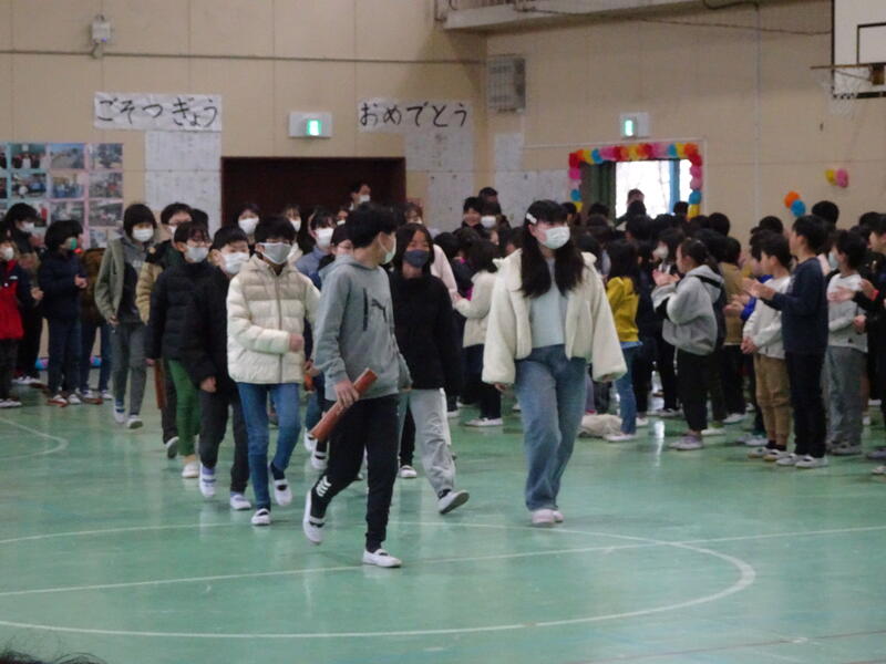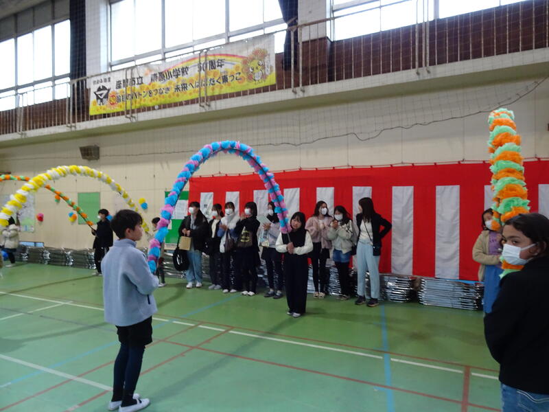 全校児童で、5年生の鼓笛演奏に合わせて校歌を歌いました。そして、下級生たち、かめっち、先生方の見守られる中、6年生はアーチをくぐって退場しました。