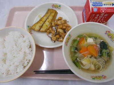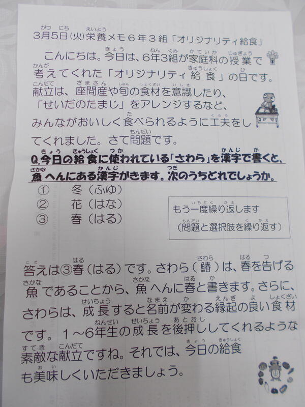 この日の給食の献立は、6年3組さんのオリジナルメニューです。いろいろと工夫されていて、おいしくいただきました!