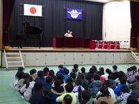 体育館に全校児童が集まって修了式を行いました。話を聞く態度が立派でした。