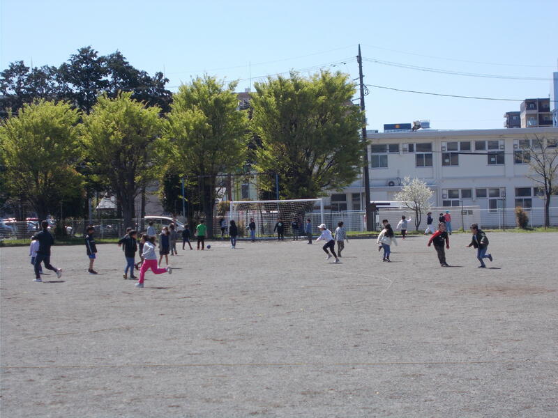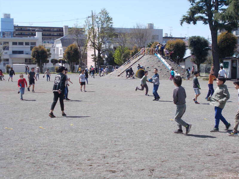 気持ちのいい日。広い校庭でのびのびと遊ぶ子どもたちです。