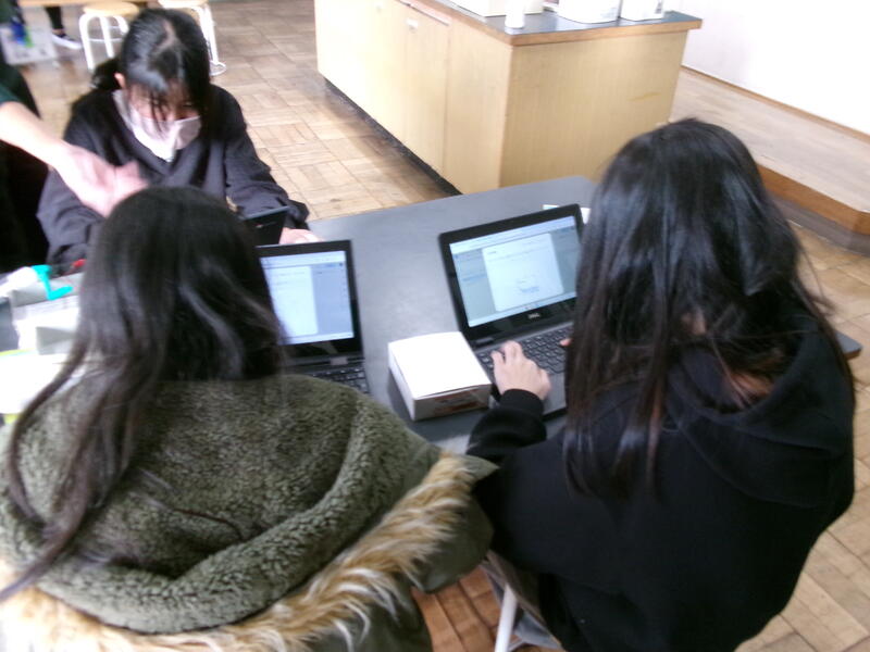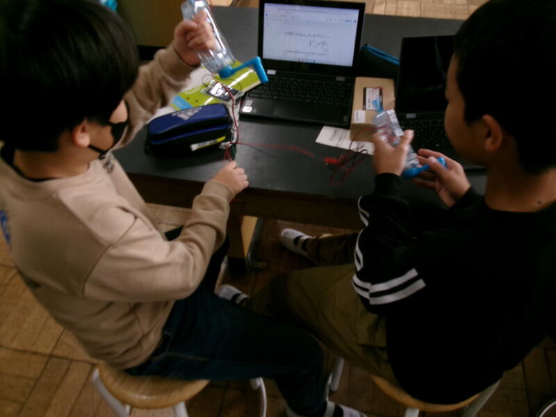6年生が理科の実験を行いながら、クロームブックで実験について考えをまとめていました。手動で電気をつくり豆電球の明かりを灯していました。