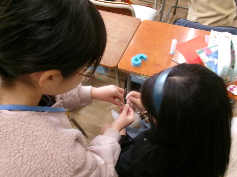 2年生は、クリスマスの飾りを作っていました。紐を結ぶのに苦労・・・教え合っていました!そして、みんなが出来上がった飾りを見せてくれました。