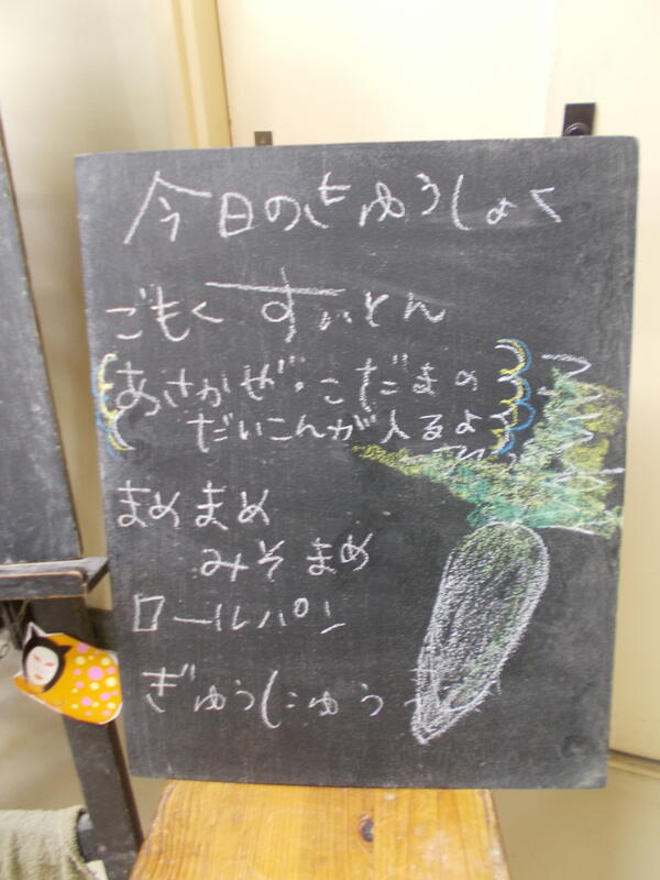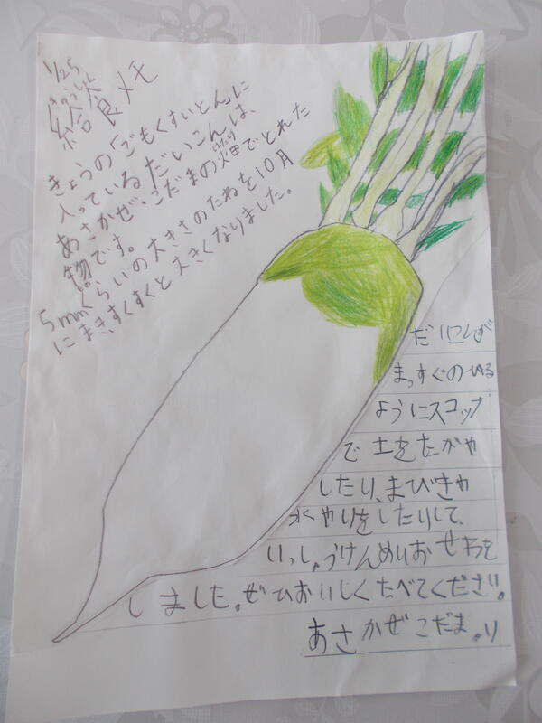 1月25日(木)の給食のすいとんには、あさかぜ・こだま級のみなさんが育てて収穫した大根が入っていました。とても素敵な給食メモも作ってくれました。ごちそうさまでした!!あさかぜ・こだま級の畑を通りかかると、一生懸命作業している姿を見かけました。愛情たっぷりの大根は甘みがあって、とてもおいしかったです。