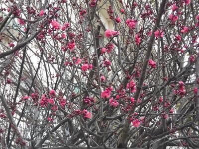 2月4日(金)校庭の紅梅が咲いていました。数日前から咲き始めました。この後、白梅、池の前のしだれ梅が順に咲くと思います。