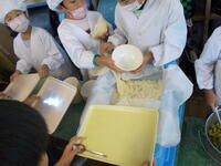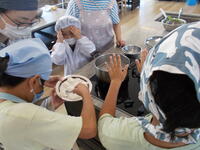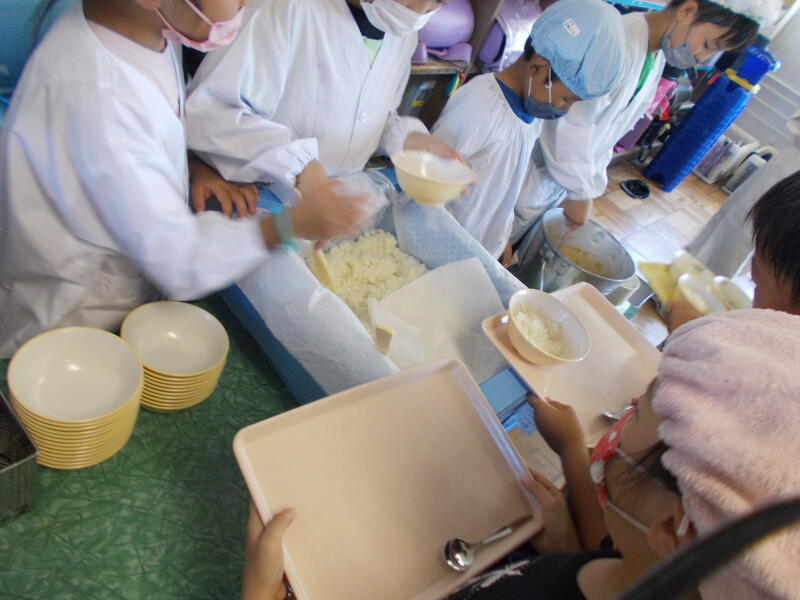 これまでは、ごはんのお弁当箱を一人ひとりに配っていましたが、2学期から、お茶碗にしゃもじを使ってよそうやり方に変わりました。