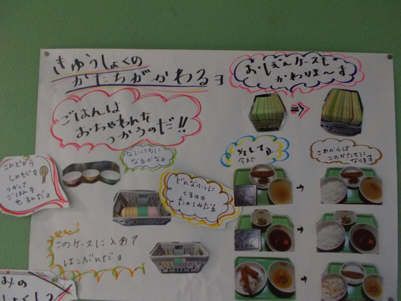 調理員さんが「きゅうしょくのかたちがかわるヨ」とわかりやすい掲示物を作ってくれました。