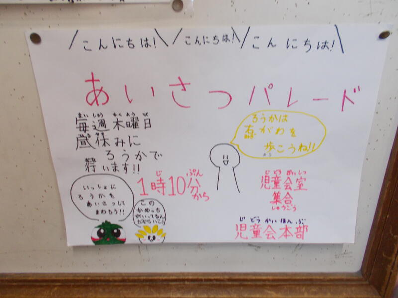 昼休みに、児童会が中心になって行っている「あいさつパレード」がありました。誰でも参加OKなので、たくさんの子どもたちが次々参加していき、「こんにちはー!」と大盛り上がりでした。