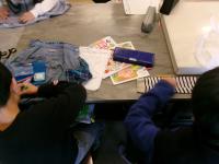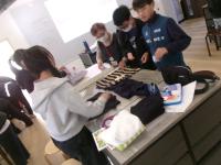 ぶんぶんごま作り。「ぶんぶん」と音を立てて回すのはなかなか難しい。コツをつかんで上手に回す子、挑戦する子。図工クラブ。
