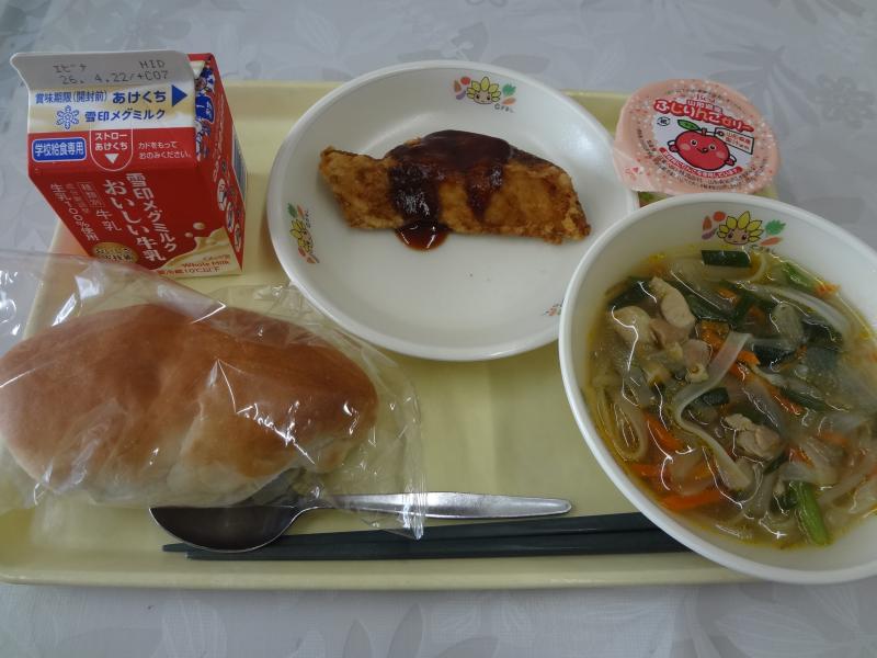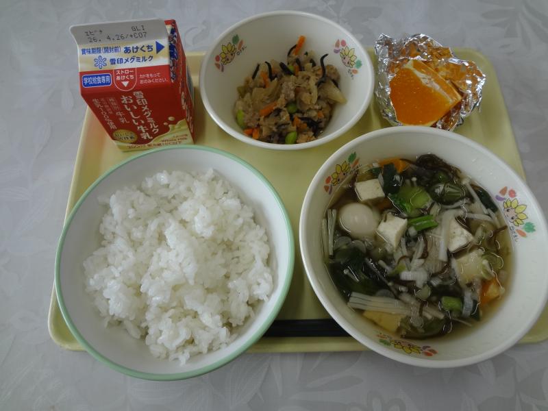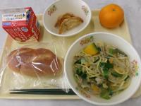献立は、ミルクパン、牛乳、野菜ラーメン、揚げ餃子、ポンカンです。ラーメンにかぼちゃが入っているという斬新なアイデアもあり、見た目もきれいで、おいしい給食でした!