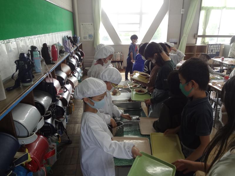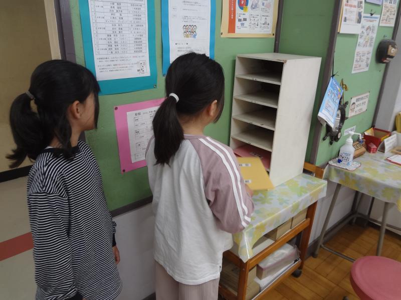 教室では、班長さんが朝の支度を手伝っています。