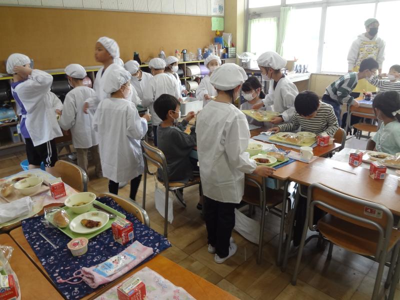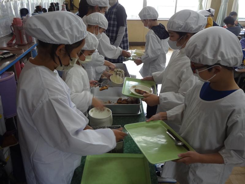 給食当番は、白衣に着替えてみんなで協力しながら配膳をします。どのクラスも上手に配膳をしていました。