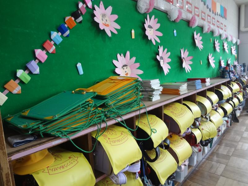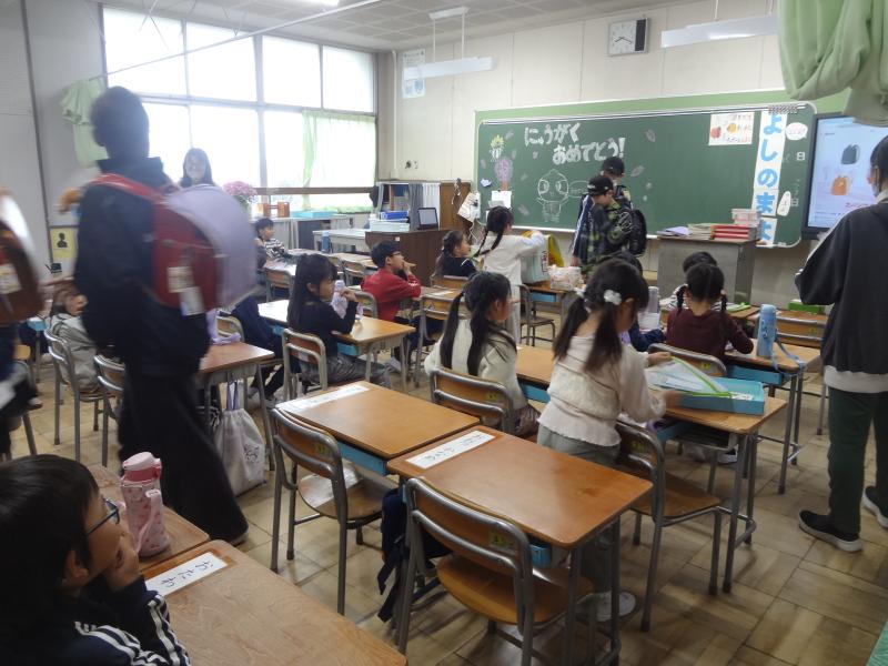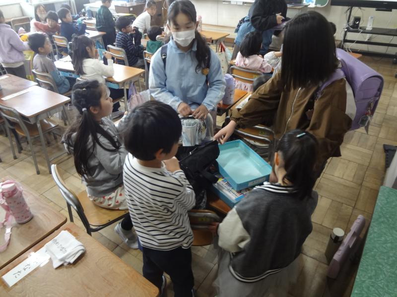教室へ到着すると、ランドセルから荷物を出します。きちんとできるまで、6年生が見守ったり、お手伝いをしたりしています。