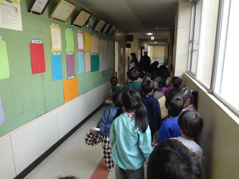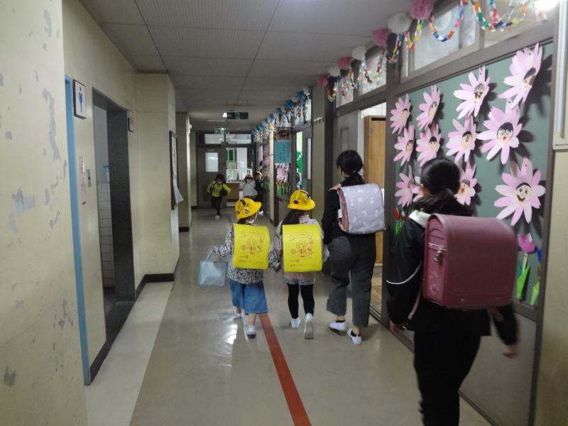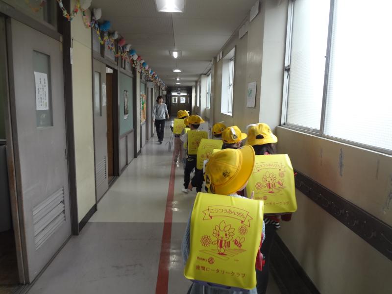 色別の下校班に並び、廊下は右側を歩いて行きます。すれ違う職員に「さようなら。」とあいさつを交わしていました。