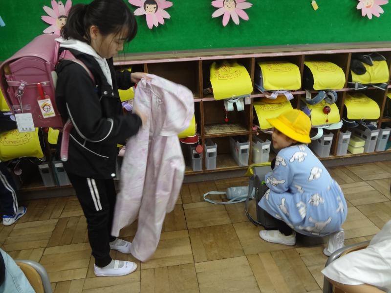 雨の日ならではの光景です。レインコートが上手にたためなくて、班長さんがお手伝いをしています。こんなようすを見かけると、心がほっこりします。