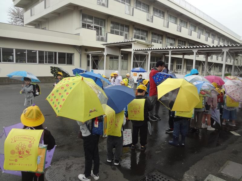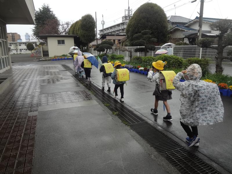 校舎を出るまでは、まったく不安はなかったのですが、今日はあいにくの荒天。昇降口で靴を履き替え、傘をさすと、あら大変!誰の後に続いていくのか分からなくなります。中には、昇降口でレインコートに着替えてランドセルを忘れてしまう児童や、風が強くて傘を飛ばされている児童もいました。