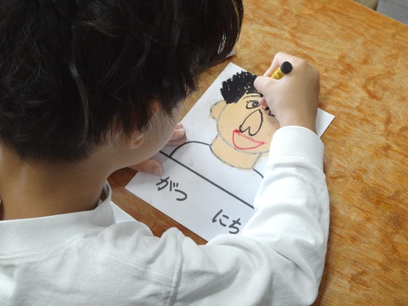 まずは、顔の大きさ、肌の色を塗って、目や鼻や口を書き足していきます。そして、髪の毛を塗り・・・洋服の色は・・・どんどん描き進めていきます。仕上がった絵はどこに飾られるのか、楽しみです。