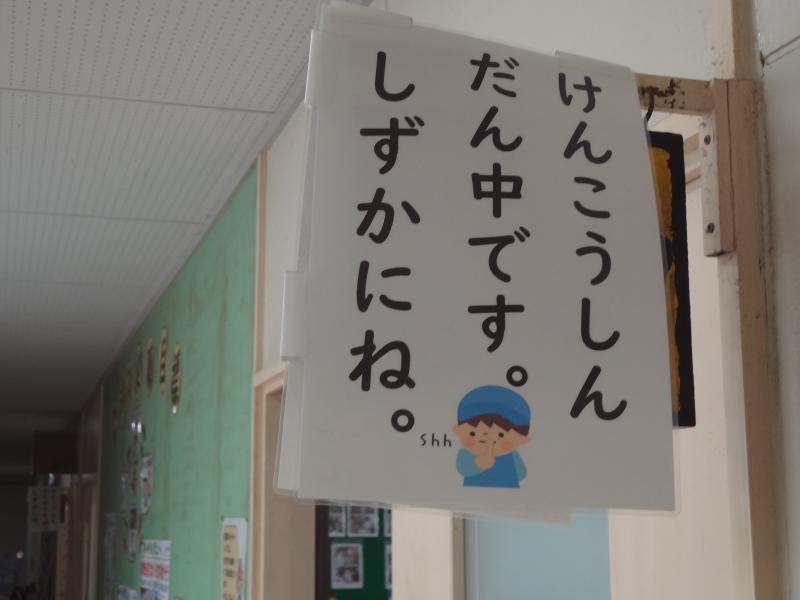 ミニ学校見学です。怪我をしたら「保健室」先生に用事があるときは「職員室」・・・廊下を歩きながら先生の説明をしっかり聞いていました。