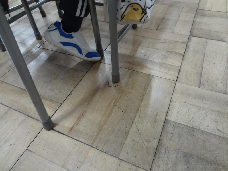 よ~く見ると床に印があります。これは、机がきれいに揃うための工夫です。「机を揃えてください。」と日直さんの合図があると、きちんと揃います。