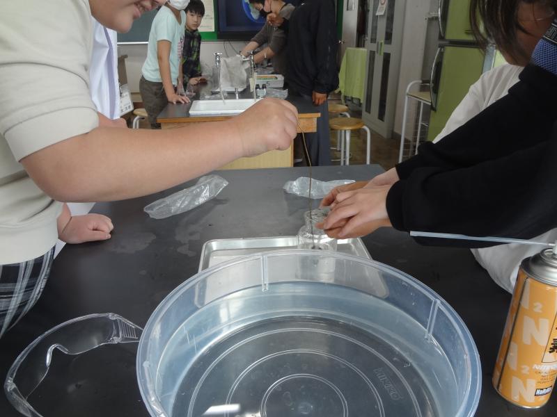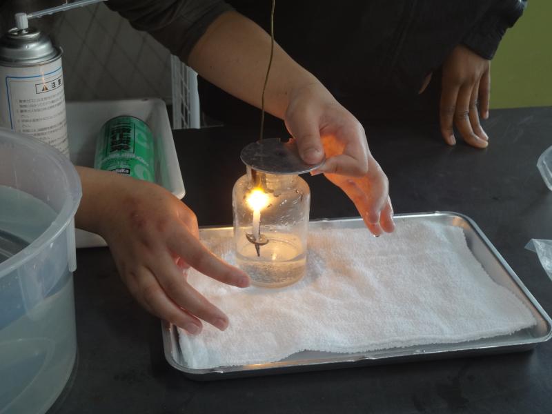 初めての「6年生の理科実験」です。集気びんに「窒素」「酸素」「二酸化炭素」をそれぞれ集めて、ロウソクの炎の燃える様子を観察する実験です。