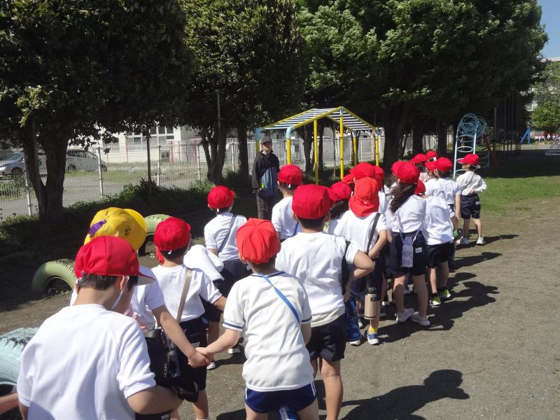 今日は、初めて校庭へ行きました。体育の学習です。新しい赤白帽子がにあっていました。校庭で学習するときは、水筒を肩から掛けて出かけます。熱中症対策のため、学習の合間に水分補給をすように声をかけています。広い校庭にはたくさんの遊具があります。遊具の使い方を説明し、安全に遊ぶことを教えていました。