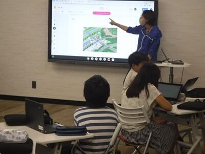 全員がタブレットを使って、絵で示された地域の危険個所を見つけ、その画像に付箋を付け、コメントを書いたものを相互に見合って考えを深めるという授業でした。