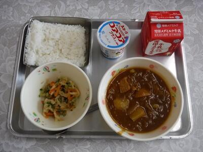 今年度最初の給食は、カレーライスに切り干し大根サラダ、ヨーグルトに牛乳です。