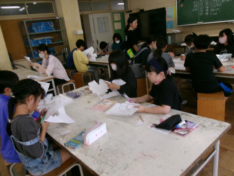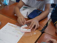 手作り!の模型をデンタルフロスできれいにする体験活動もあり、子どもたちは模型の歯にはさまった汚れを必死に取り除きました。体験することで、たくさんのつぶやき、気づきがありました。